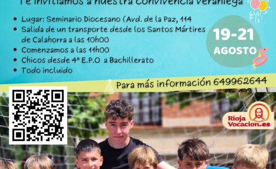 Ya entrados en el verano, solamente recordaros que tendremos nuestra convivencia «Seminario y piscina» del 19 al 21 de agosto en el Seminario Diocesano (Avda. de la Paz, 114 de Logroño. Como todos los veranos preparamos para chicos de 4º de E.P.O a Bachillerato unos días estupendos de descanso y […]